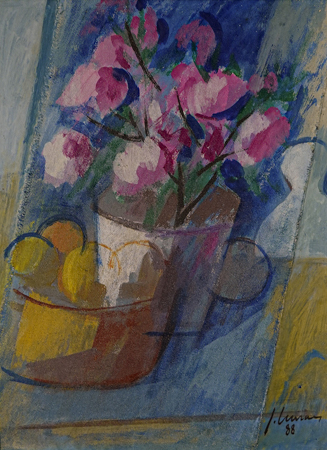 JOSÉ MORAES (1921 - 2003) Título: "Flores e frutas" Técnica: vinil acrílico e colagem sobre placa Medidas: 40 x 30 cm Assinado: canto inferior direito e dorso Data/Local: 1988 - São Paulo