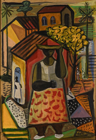 EMILIANO DI CAVALCANTI (1897 - 1976) Título: "Baiana e casarios" Técnica: guache sobre cartão colado em placa Medidas: 50 x 35 cm Assinado: canto inferior direito Data/Local: 1950 Reproduzido no Convite deste Leilão. Com Certificado de Autenticidade de "Renot Escritório de Prestação de Serviços para o Mercado de Arte", datado de 28 de setembro de 2005, São Paulo - SP.