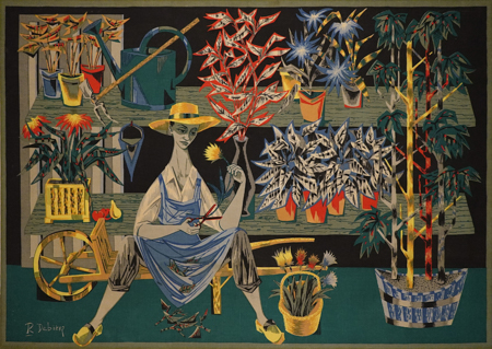 ROBERT DEBIÈVE (1925 - 2018) Título: No jardim Técnica: tapeçaria Medidas: 112 x 158 cm Assinado: canto inferior esquerdo Tapeçaria montada em chassi, sem moldura. (Obra de artista estrangeiro vendida como "atribuída")