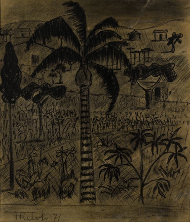 FRANCISCO REBOLO GONSALES (1903 - 1980) Título: Paisagem Técnica: desenho a crayon Medidas: 28 x 24 cm Assinado: canto inferior esquerdo Data/Local: 1971 Essa obra participou da exposição "Operários na Paulista" realizada na Galeria de Arte do Sesi - Av. Paulista, 1313 - no periodo de 17/09 a 19/01/2003, organizada pelo Museu de Arte Contemporânea da Universidade de São Paulo - MAC-USP, conforme etiqueta no dorso e recibo de entrega da obra. Obra procedente da coleção do Poeta, Jornalista e Crítico de Arte, Carlos Soulié Franco do Amaral, São Paulo - SP. Paspatour no estado.