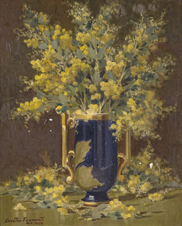 GASTÃO FORMENTI (1894 - 1974) Título: Vaso com flores Técnica: óleo sobre madeira Medidas: 41 x 33 cm Assinado: canto inferior esquerdo Data/Local: 1952 - Rio Restauro necessário e moldura no estado.