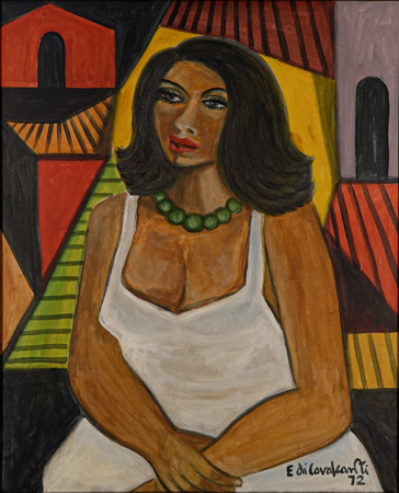 EMILIANO DI CAVALCANTI (1897 - 1976) Título: "Mulata com colar de esmeraldas" Técnica: óleo sobre tela Medidas: 80 x 65 cm Assinado: canto inferior direito e dorso Data/Local: 1972 - Guarujá Reproduzido no Convite deste Leilão. Acompanham a obra: 1 - Recibo de venda firmado pelo Artista, datado Guarujá, Maio de 1972 em papel timbrado do Hotel Jequiti-Mar. 2 - Certificado de Autenticidade de "Renot Art Dealer", datado de 10 de abril de 1997, São Paulo - SP. Ex coleção Sr. Caio Ribeiro, São Paulo - SP.