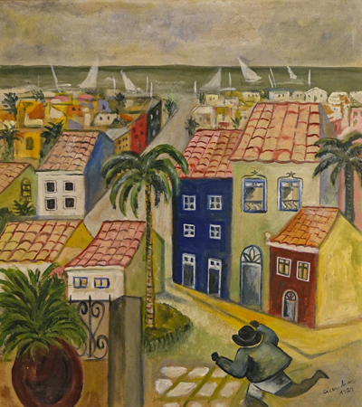 CÍCERO DIAS (1908 - 2003) Título: "Porto de Recife" Técnica: aquarela e guache Medidas: 51 x 46 cm Assinado: canto inferior direito e dorso Data/Local: 1929 Reproduzido no Convite deste Leilão. Com a seguinte dedicatória no dorso: "Para Noêmia minha querida amiga de sempre Cícero Dias 1939". Acompanham a obra: 1 - Declaração de Noêmia Mourão informando que a obra foi a ela presenteada em Paris no ano de 1939 quando eram colegas na "Radio Difusion Française", datada 29/10/1984, com firma reconhecida em cartório. 2 - Atestado de Autenticidade, emitido pela Prof. Dra. Maria Cecília do Amaral Campos de Barros Santiago, Perita em Obras de Arte da Receita Federal do Brasil e Professora de Perícia Grafotécnica em Artes Visuais da Faculdade Santa Úrsula - Rio de Janeiro.