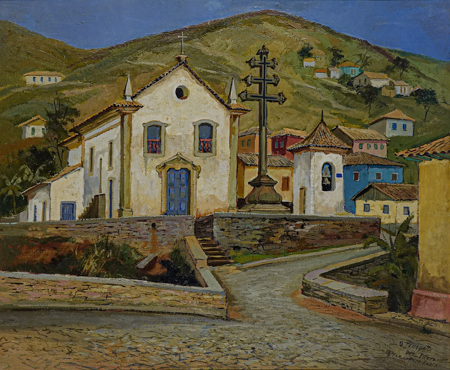 OMAR PELLEGATTA (1925 - 2000) Título: "Capela do Padre Faria" Técnica: óleo sobre tela Medidas: 54 x 65 cm Assinado: canto inferior direito Data/Local: Ouro Preto Moldura no estado.