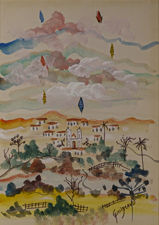 ALBERTO DA VEIGA GUIGNARD (1896 - 1962) Título: Paisagem com balões Técnica: aquarela Medidas: 22 x 15 cm Assinado: canto inferior direito Ex coleção Marchand Isaac Ficz, Rio de Janeiro - RJ.